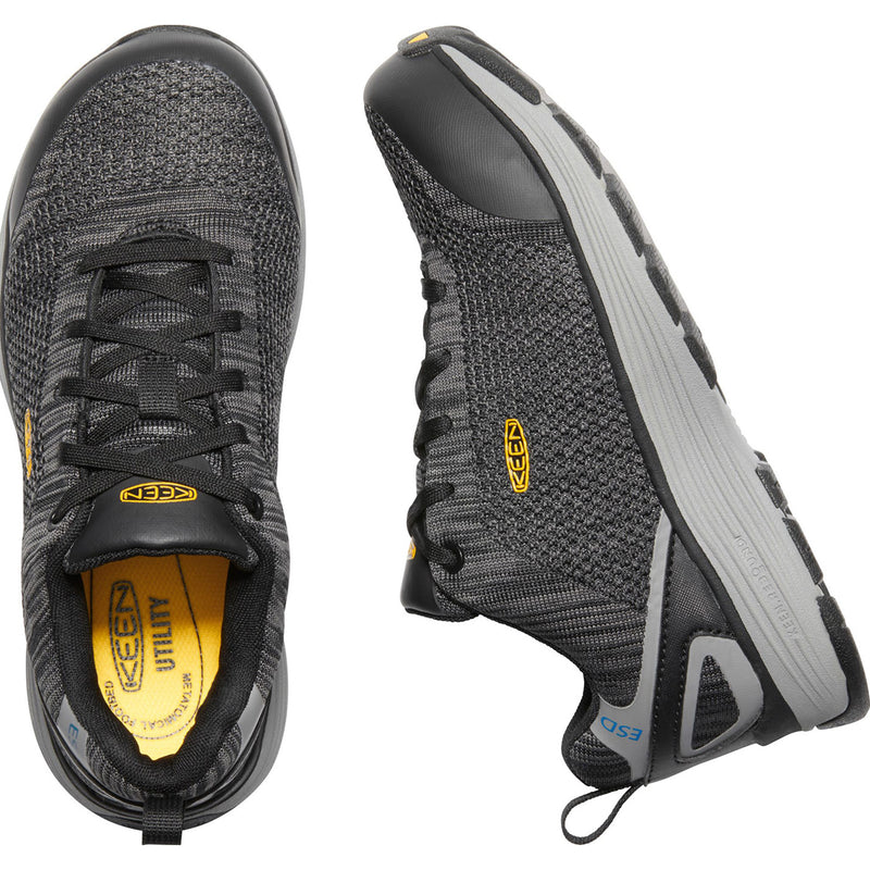 A black textile upper with a reinforced toe reduces the weight of this work shoe and gives it a sporty appearance. The KEEN.REBOUND molded PU midsole provides instant cushion yet resists compression with each footfall. A Keen Grip rubber wedge outsole not only is durable, but also earns high marks for slip and oil resistance with Mark II testing.