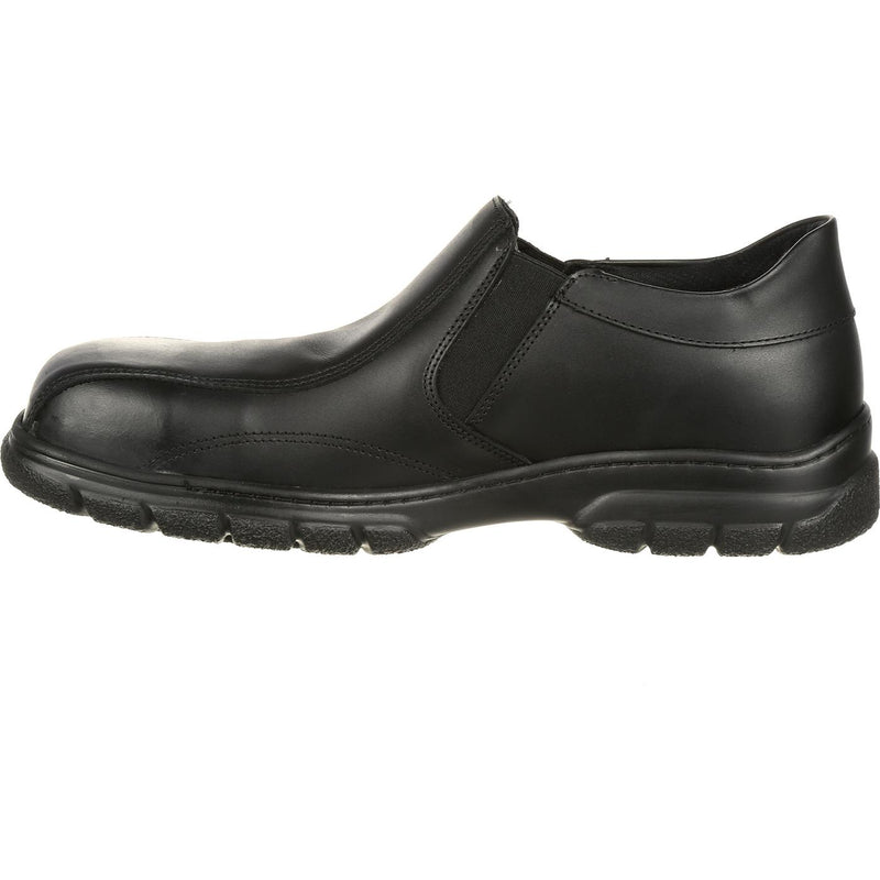The black leather slip-on shoes for men have the professional look you want and are easy to get on and off quickly. They also have safety features you'll appreciate.