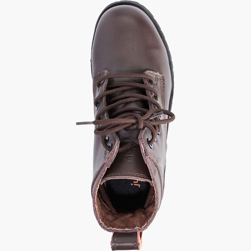 Designed by women; made for women, Juno Jones offers a fashionable work boot to wear on and off the job. Feast your eyes on the quality, environmentally certified leather of this Leeza style. This 6-inch lace-up style has a water-resisting full-grain leather upper with cement construction. Affixed to the back is a pull strap piped with a hi-vis orange for visibility.
