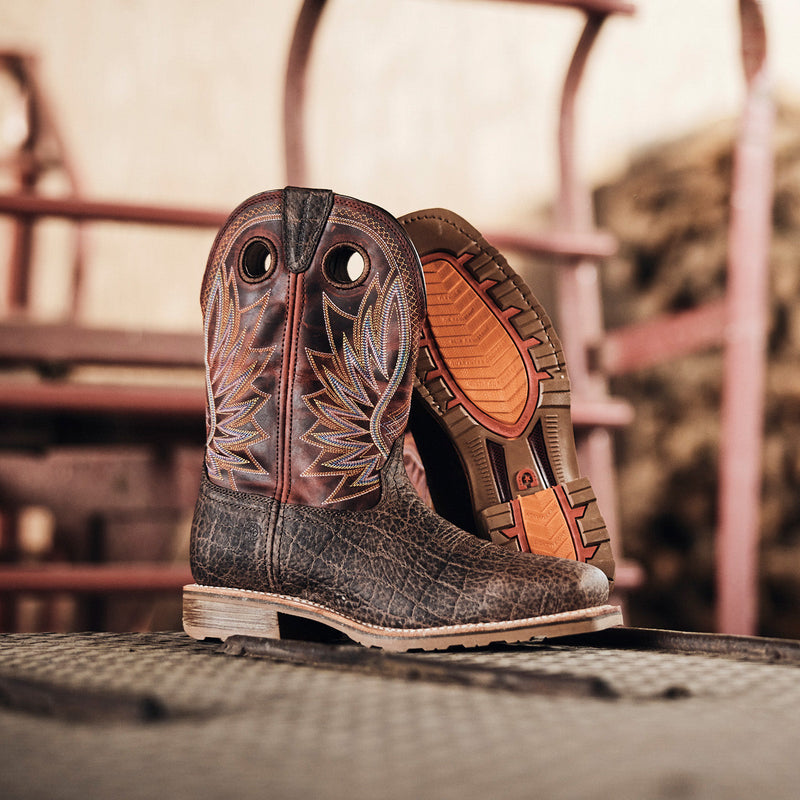 Pair of brown western work boots with elephant embossing and red leather shaft on a galvanized metal surface at a farm.