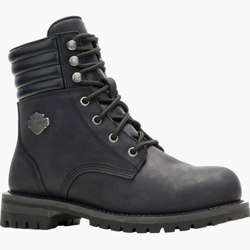 A world-recognized brand, Harley-Davidson brings edgy style and durability to the workplace. The women's Gynger ST is an all-black full-grain leather safety toe work boot. Reaching 6 inches in height, these women's lace up boots have the signature metal Harley-Davidson badge on the side and quality Goodyear Welt construction. Underfoot the rubber outsole has a 1 1/2-inch defined heel and a multi-purpose tread that is ASTM slip-resisting. A round toe houses a steel safety toe cap that is ASTM F2413 work footwear certified for impact and compression and these boots are electrical hazard resisting to the same ASTM standard. The interior is lined with a mesh fabric and this boot has a removable footbed. Get a pair of the durable Harley-Davidson safety work boots today.