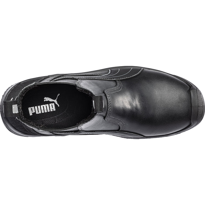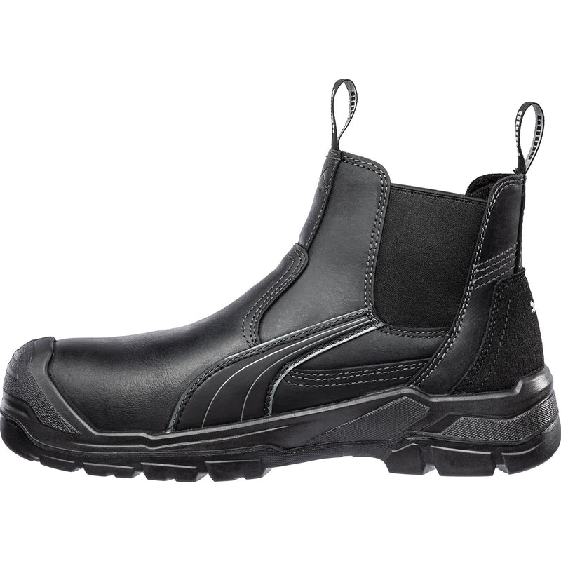 Do you enjoy the convenience of a pull-on Chelsea, but want the comfort and presence of a Puma Safety shoe? Then consider the men's Tanami Mid Chelsea. This 6-inch pull-on style, in black smooth leather, has stretch gore panels and pull loops to help with foot placement. The toe area is reinforced with an external scuff guard that helps with abrasion. A TPU heel guard reinforces and also aids with kick-off, helping you to remove your boots.